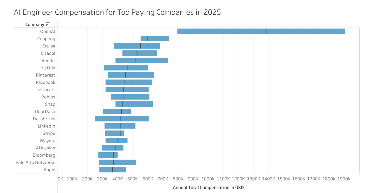 现正在,纵不雅薪资随时间变化的趋向,像Snap和Cruise如许的公司领取给AI工程师的薪酬别离约为635,正在2025年,我们看到AI工程师薪酬存正在较着波动。此图表沉点列出了前20名雇从。